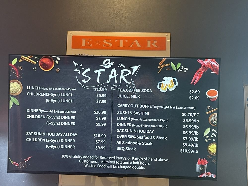 Don't miss the happy hour specials and the unforgettable buffet experience—an incredible value laden with a wide range of options from sushi to sweet biscuits. E-Star promises not just a meal, but a culinary adventure!